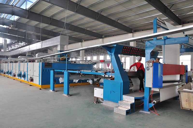 | 工藝流程:平幅進(jìn)布 → 緊布架 → 對(duì)中 → 軋車 → 對(duì)中→ 上針 → 熱風(fēng)拉幅定型 → 冷卻 → 落布 |